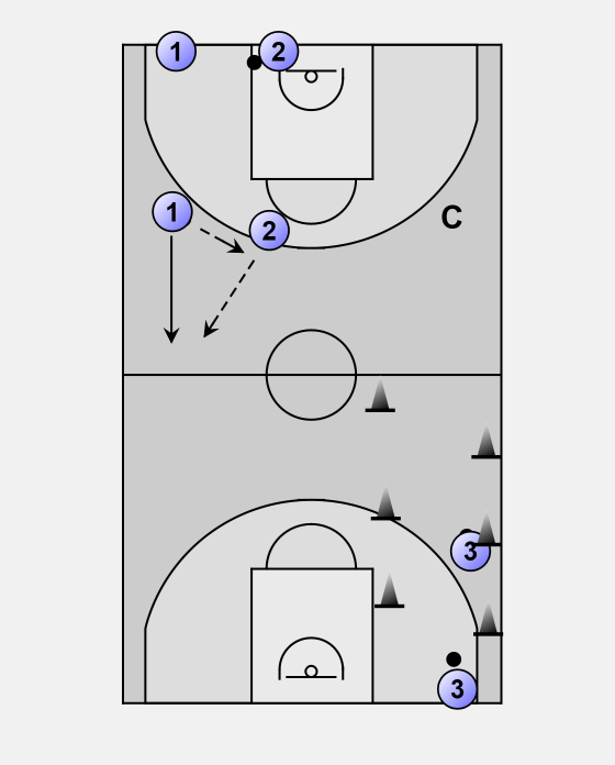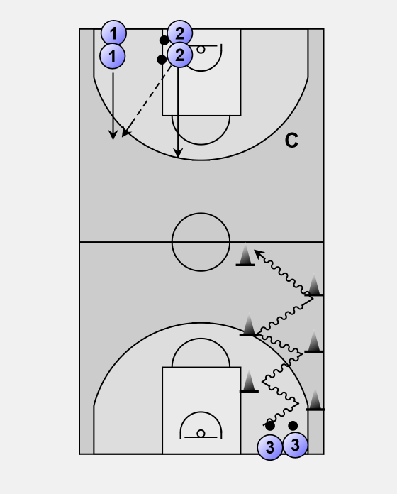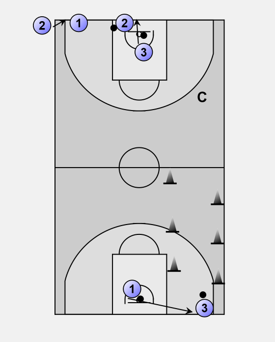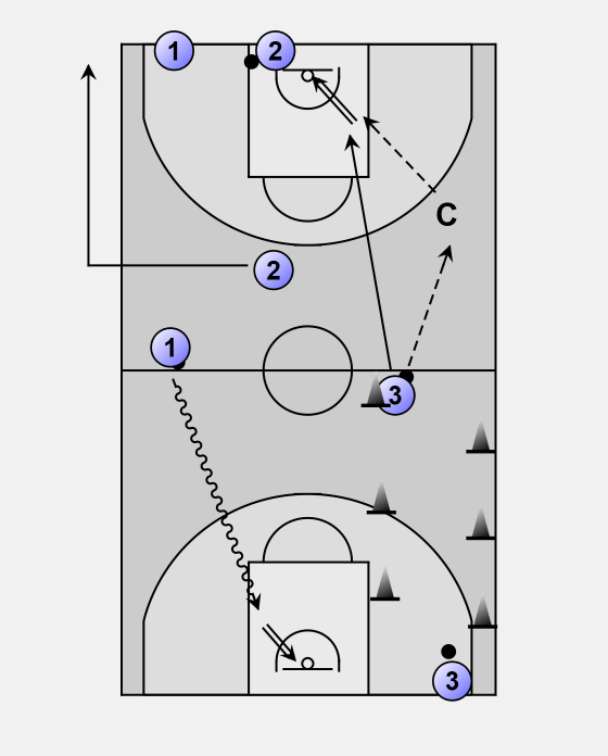 3 gives a pass to a fixed pass giver (coach), and gets the ball back to make a lay-up without a dribble.