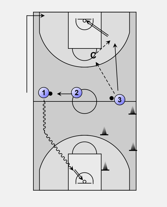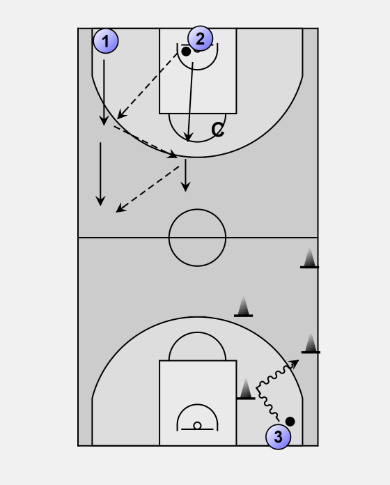 Give and go between 1 & 2, when 1 reaches the middle he makes a slow dribble changing to a quick and ends with a left lay-up.