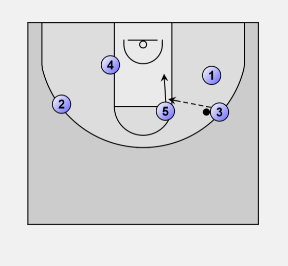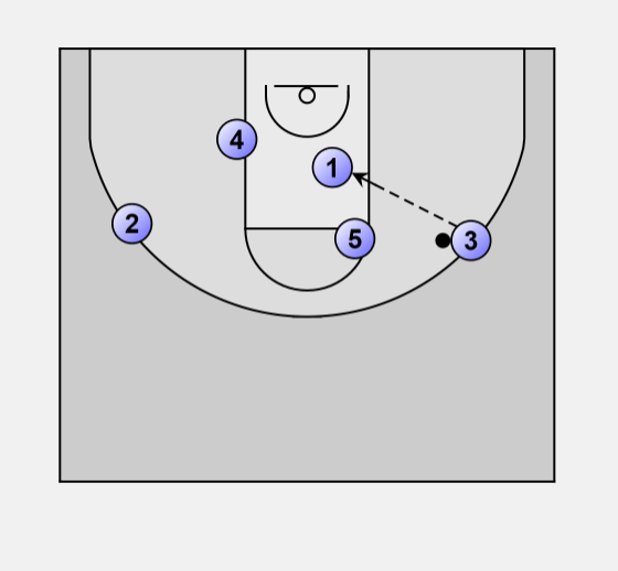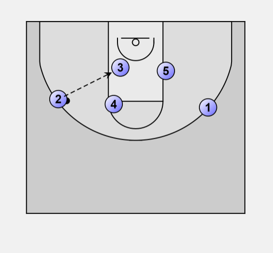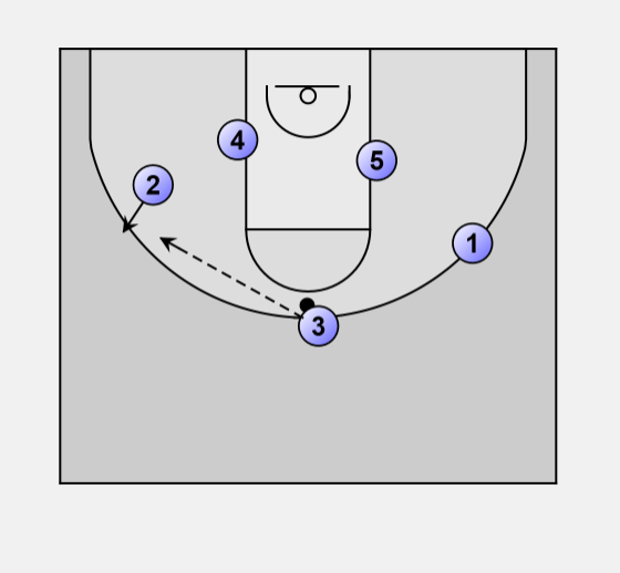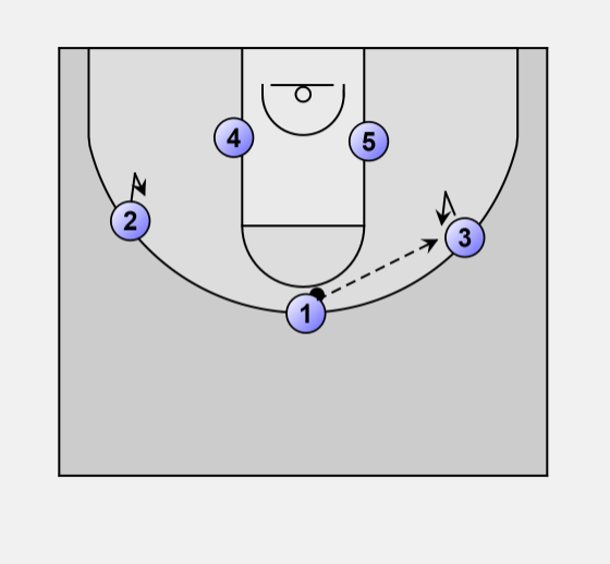 Ball starts in the middle, and is passed to one of the open wings (in this case #3)
