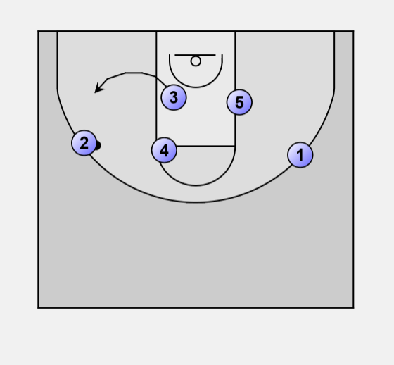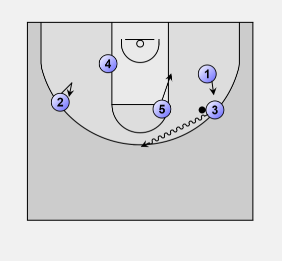 As ball goes to left wing, #3 cuts to hoop along the left side of the lane.