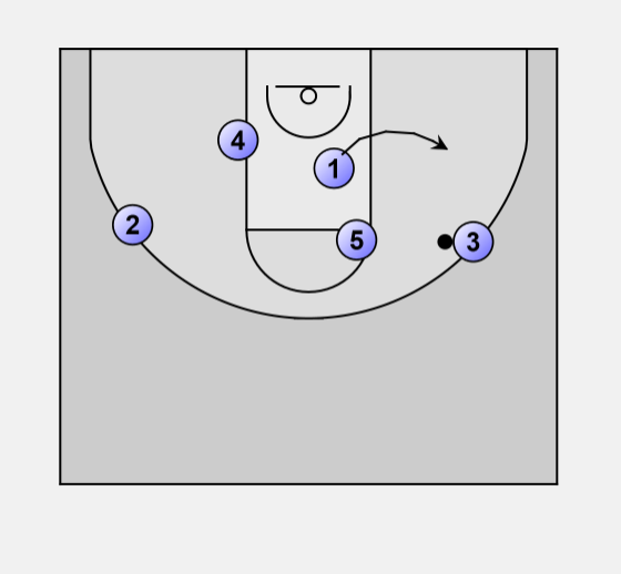 As ball goes to right wing, #1 cuts to hoop along the right side of the lane.