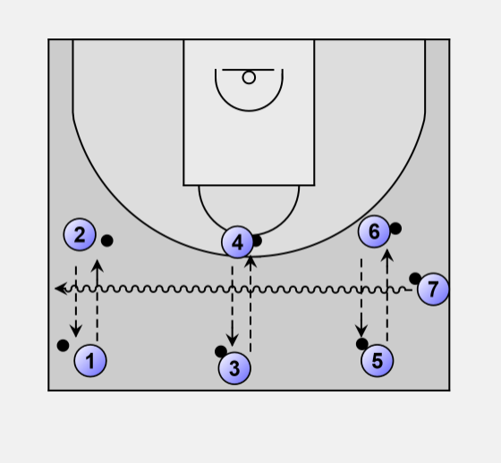 • 7 must dribble, running low enough to go underneath all the passes.