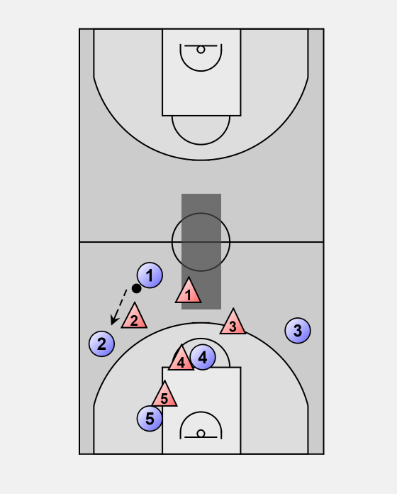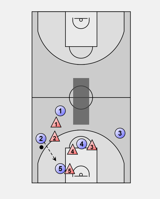 If P2 passes P5 on the low post, all players act as in regular man-man help defense. (By my meaning that is) D3 sags to middle line, D4/D1 sags to ball. D2 sags to ball and tries to steel if, and only if, P5 bounces the ball.