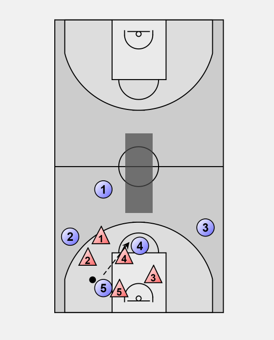 If ball is passed to high post (P4) D4 steers P4 to strong side. This to prevent the ball from moving to the weak side.