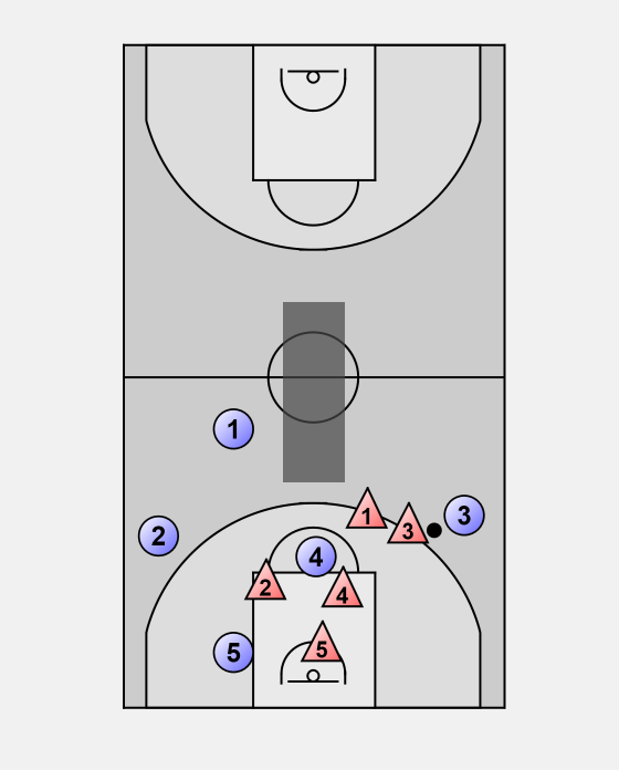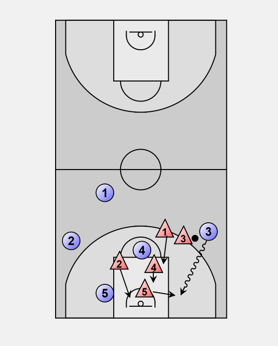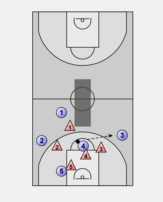 If Weak side forward (P3), gets ball D3 steers P3 towards the baseline (closing elbow cut).