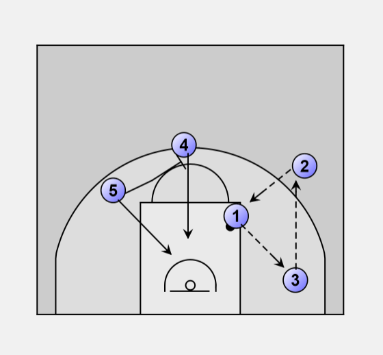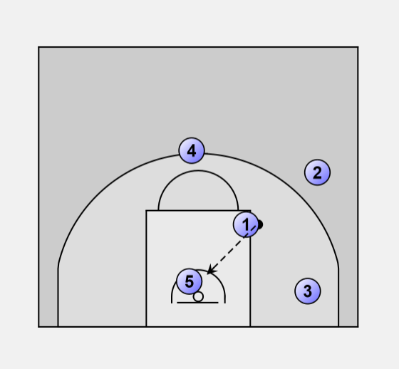 After all defense starts to key on those players player 1 passes ball to player 5 making a back door cut.