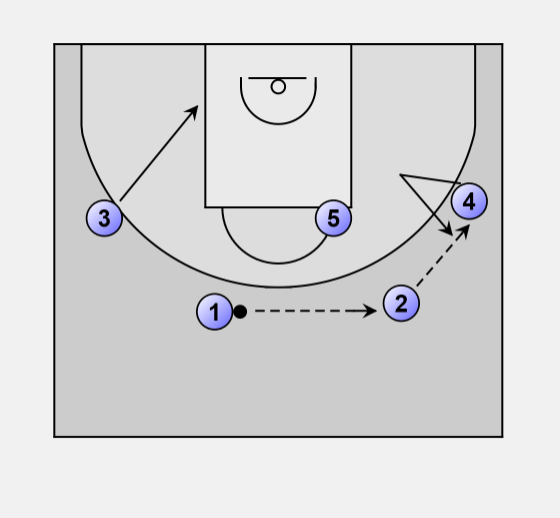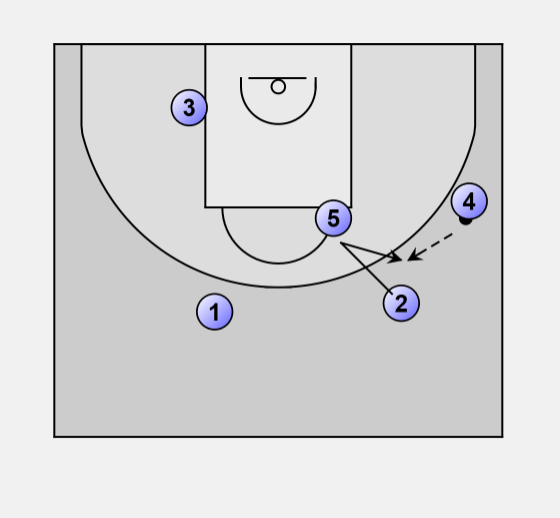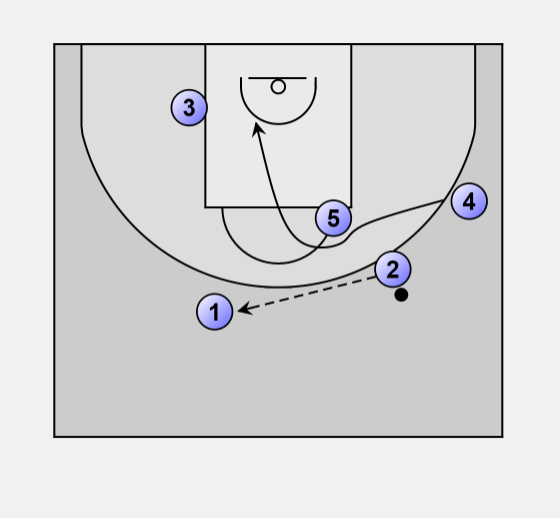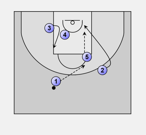 • 1 feeds the ball to 5, as this pass is being made, 2 takes off through the back door for a lay up.