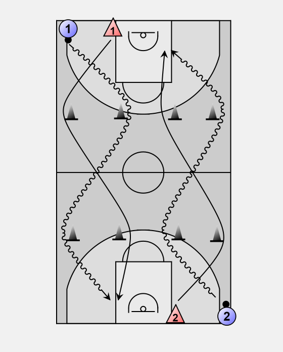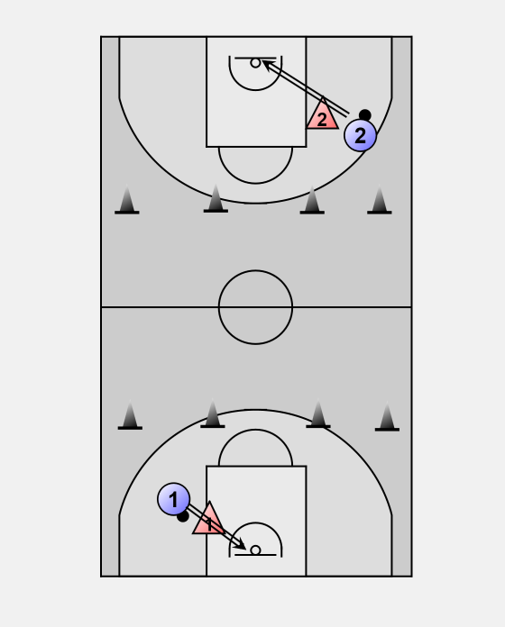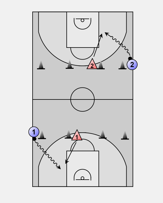 Offensive player dribbles towards the outside cone while the defender runs to the inside cone.