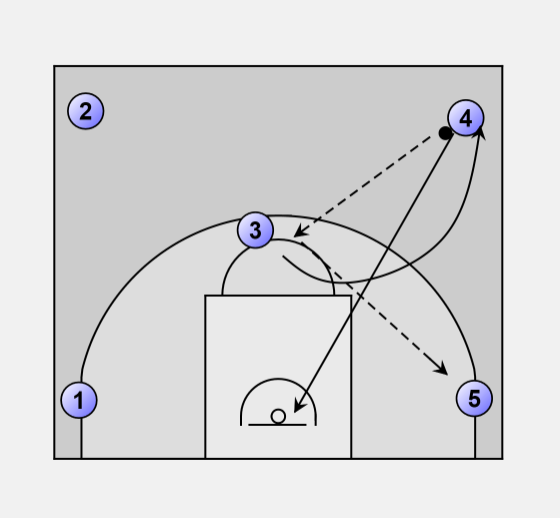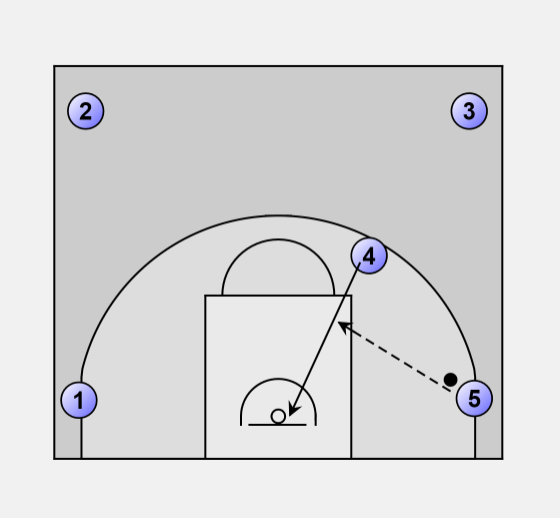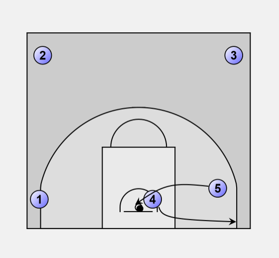 Player 4 cuts to the basket, player 5 passes in, and player 4 shoots the layup.