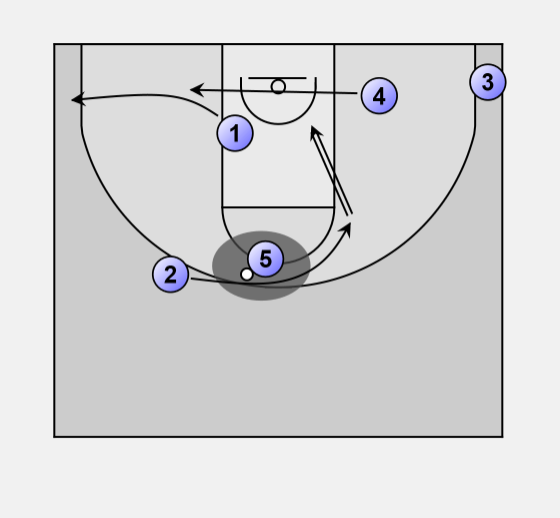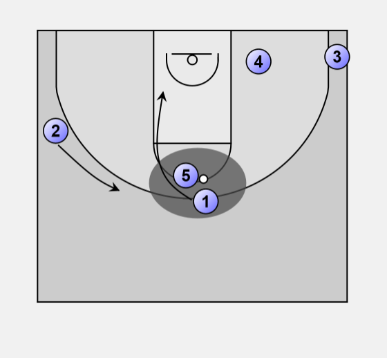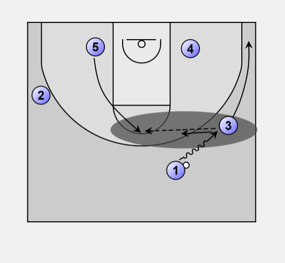 Nash #1 enters the ball into Howard #5 then cuts hard off his shoulder, Howard turns as if he is going to hand it back.