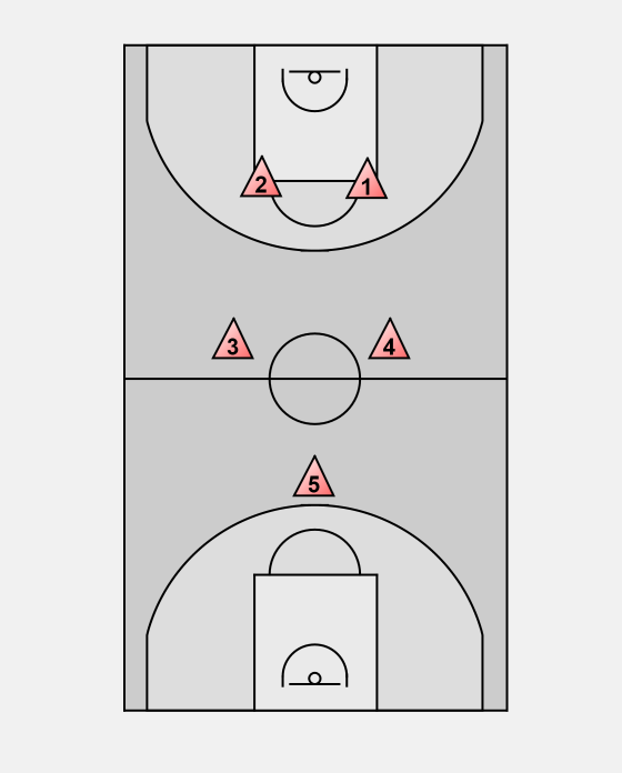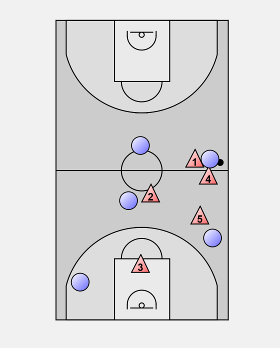 The opponent inbounds to their left side. We allow the pass, then our guard on that side (1) will apply immediate pressure, forcing the ball handler up the sideline. 1 cannot allow the ball handler off of the sideline.