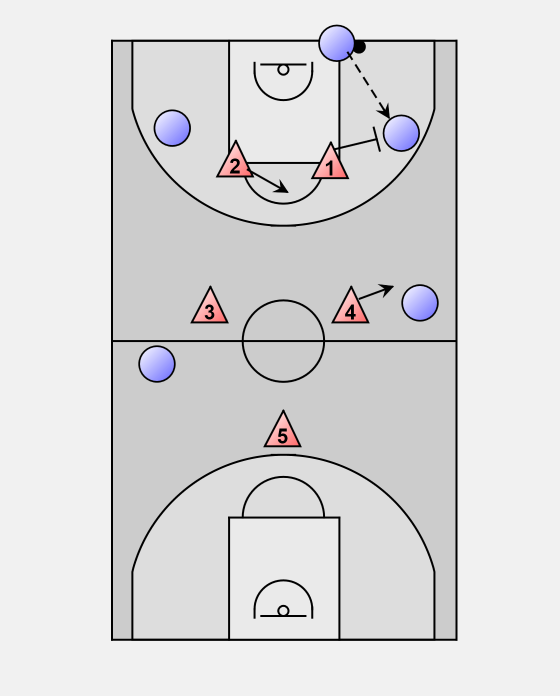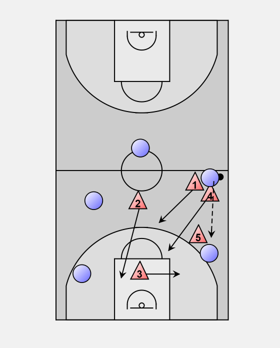 4 retreats out of the trap to cover the high post ballside.