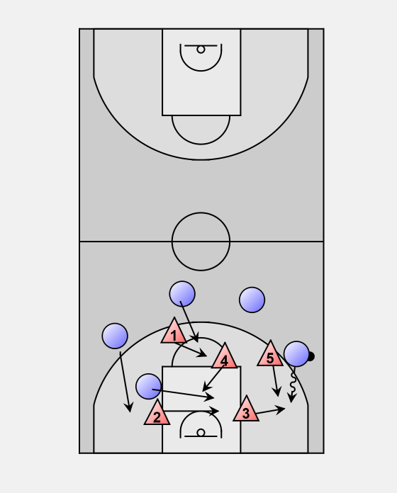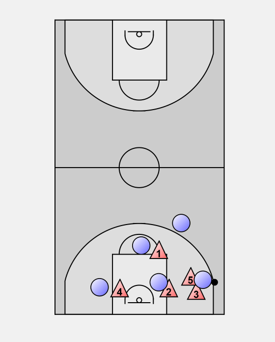 Here we have the ball contained by 5 and the blocks and the high post are covered.