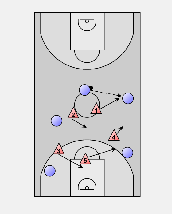 1 will immediately attack the ball handler, again keeping her on the sideline and forcing her up the court into a trap with 4.