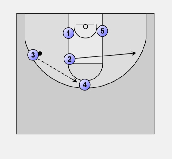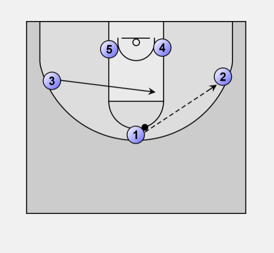When 3 receives pass, he looks to 1 at the short corner or to 3 at the elbow.