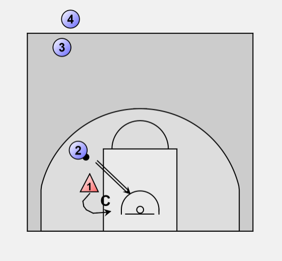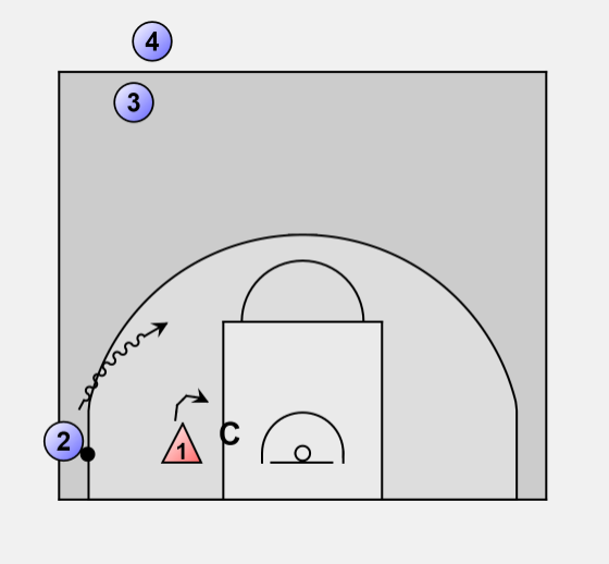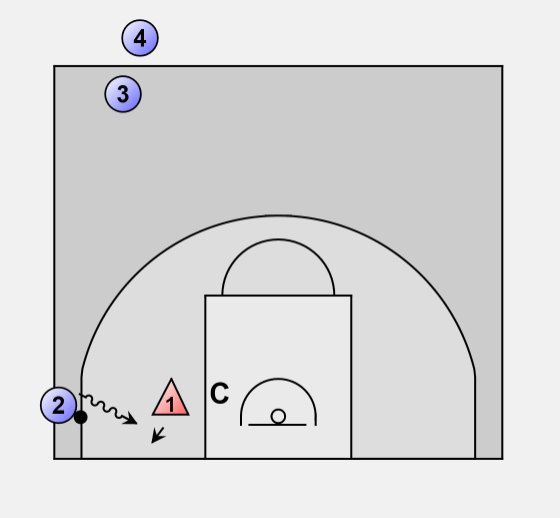 #2 dribbles down to corner and attempts dribble drive and defender comes off man to stop dribble penetration.