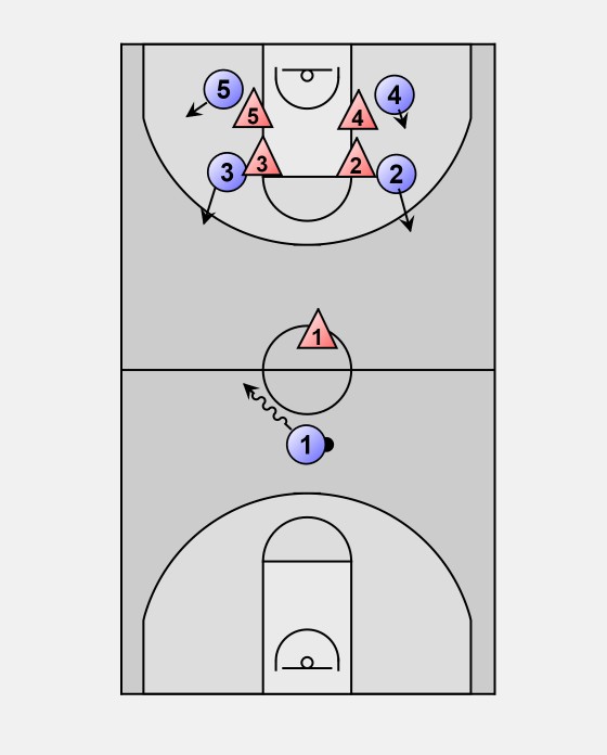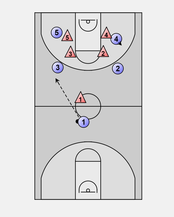 When 1 makes the pass, he gets across half court and he makes it look like he wants the ball back.