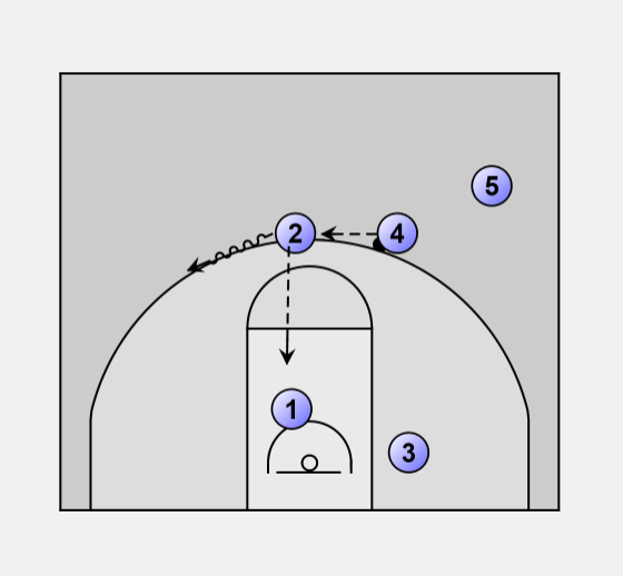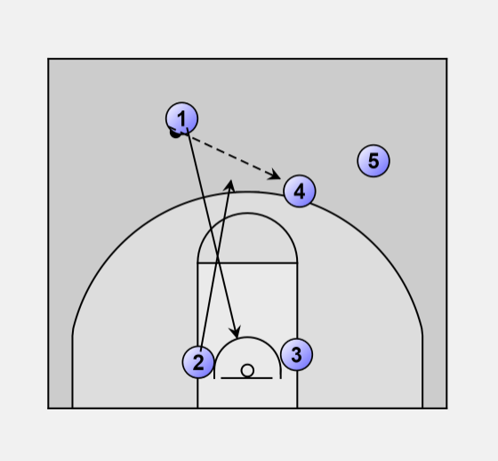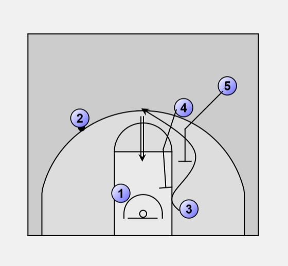 1 will pass to the 4 man of his cut, and then the point guard will dive down the middle of the lane and interchange with the two on the bottom block.