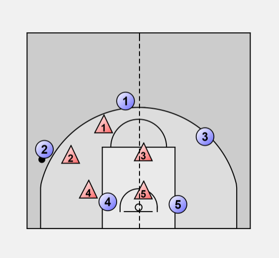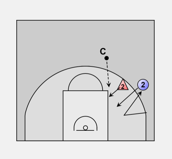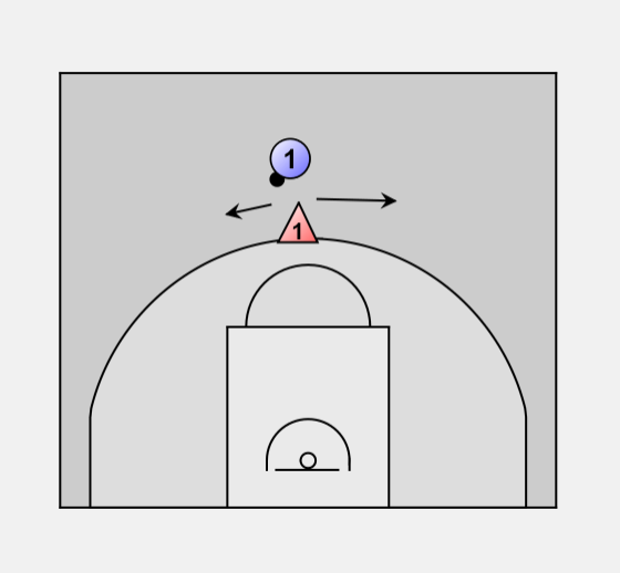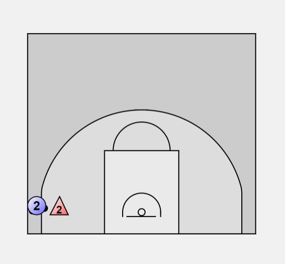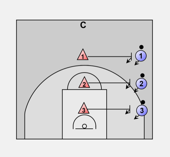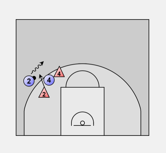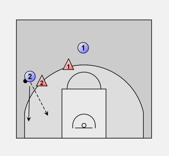O2 will do a V-cut to get open on the wing. D2 denies. O2 must get both feet outside the 3-point line, then do a back cut.