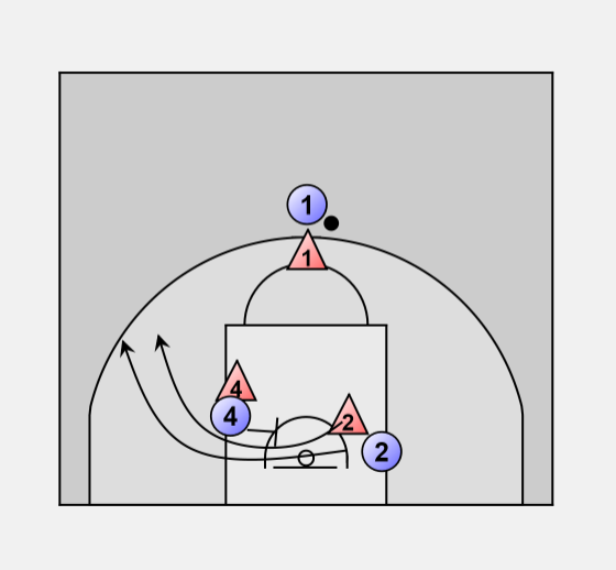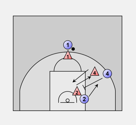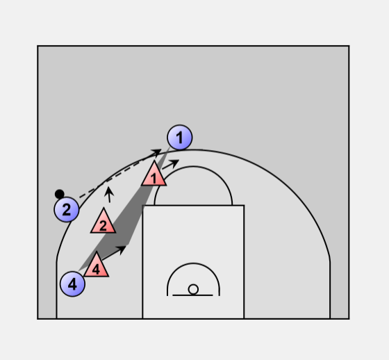 If we hedge, D4 must make the dribbler go away from his basket. D2 goes over the top of the screen to guard the dribbler. D4 recovers onto his man. Weak side defenders need to be at rim to help.