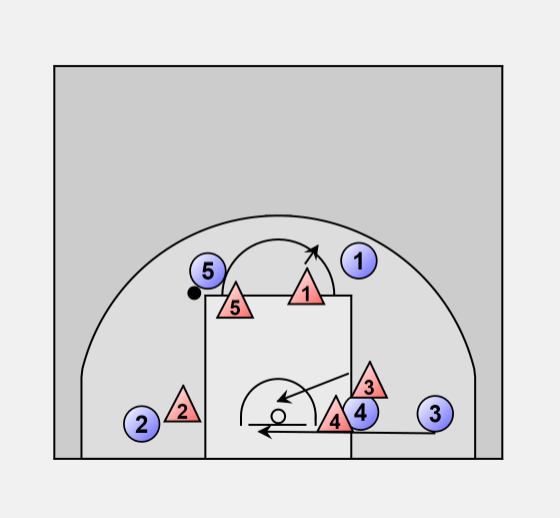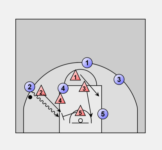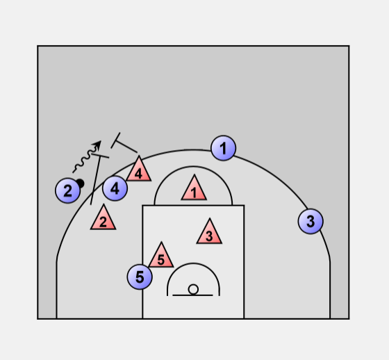 As O2 runs across the baseline to the opposite wing he is looking to come off of O4's screen. D4 will yell "screen," and hedge out to help D2.
