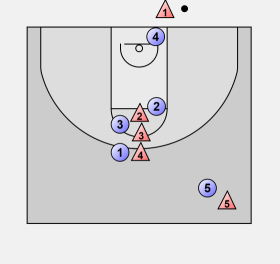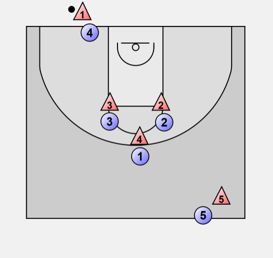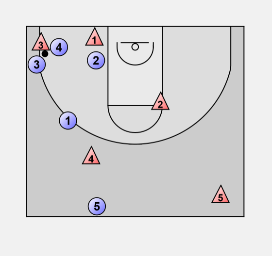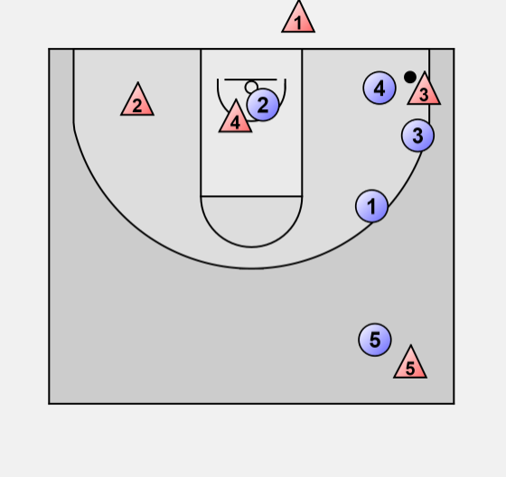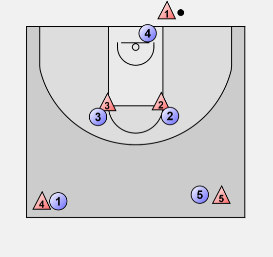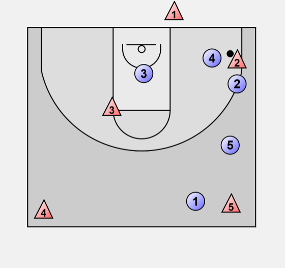 (2) will leave his man and go to the lane and looks to intercept the pass coming into the paint area or back to (1)