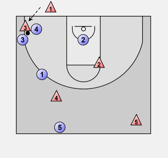 The ball goes to the corner and the (4) double teams with the (2). The (3) now leaves his man and comes to the lane to guard that area.