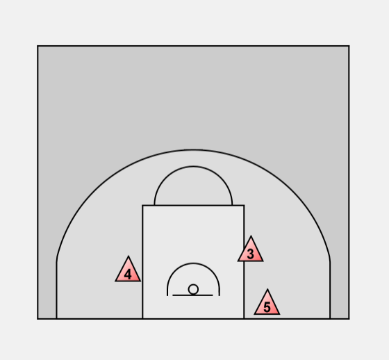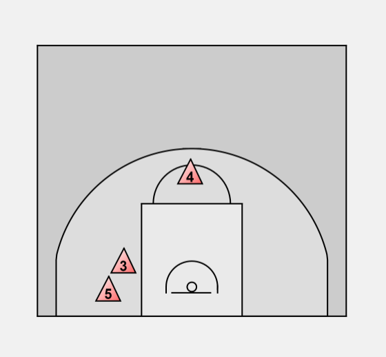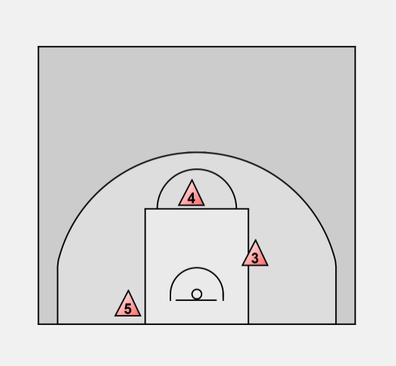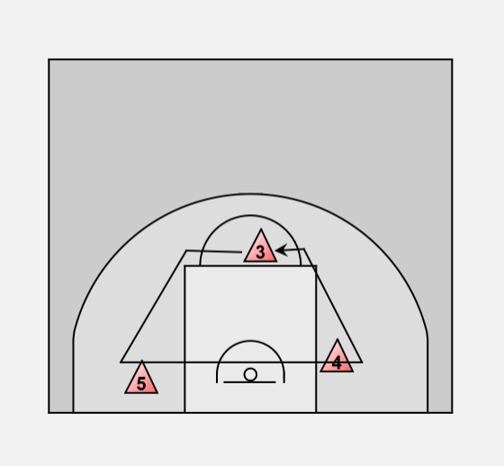 3 and 4's area is shaped as shown.If 3 goes low then 4 pops high to the free throw area.