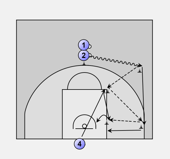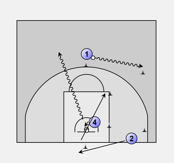 2 dribbles to the pylon at the sideline, while 4 goes to the high post asking for the ball.