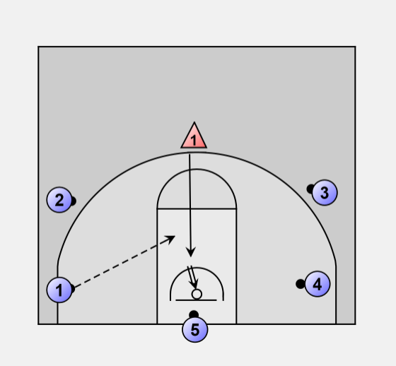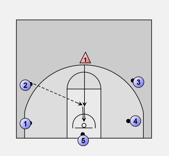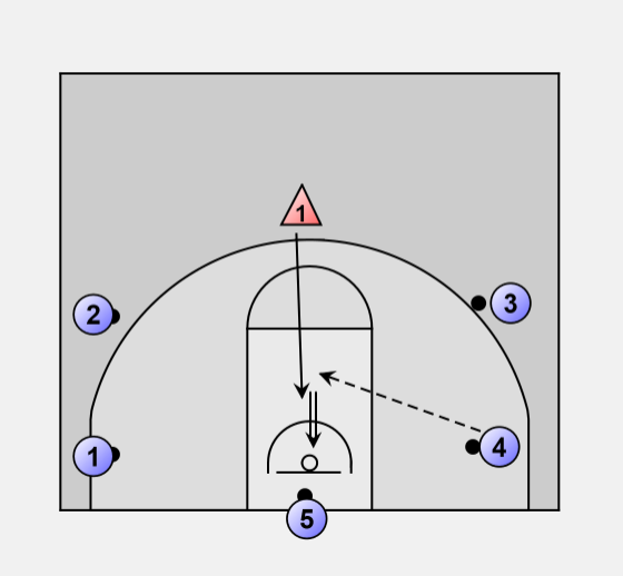 Shooter runs back to his starting point and cuts back down the key, where he will receive a pass from the low-post extended player.