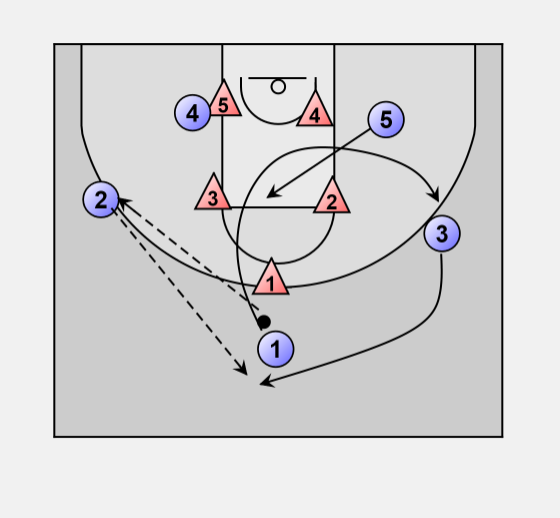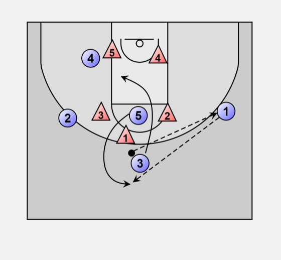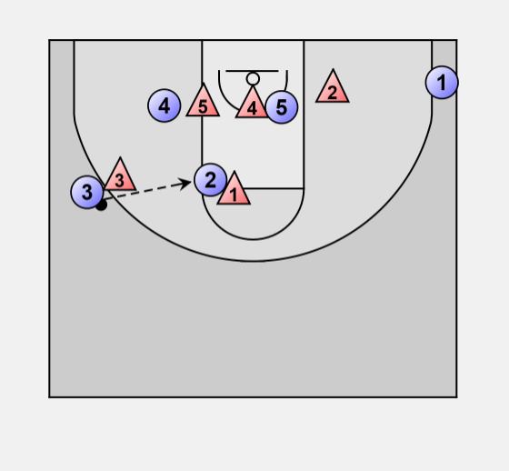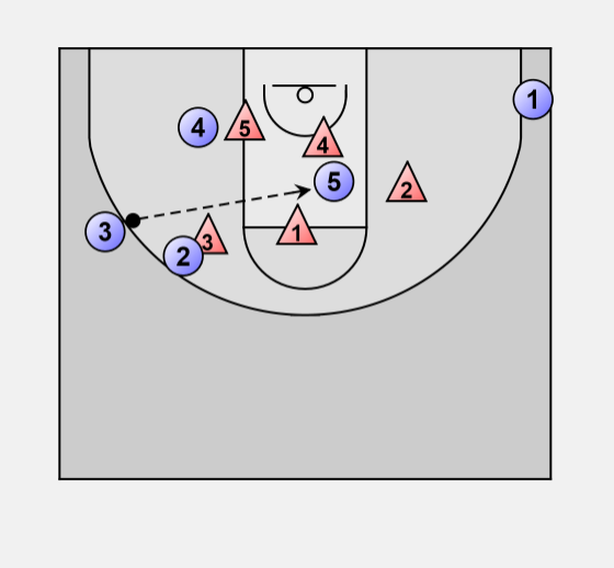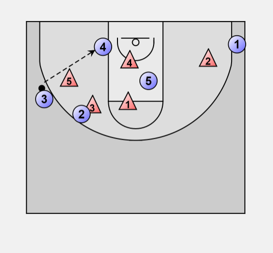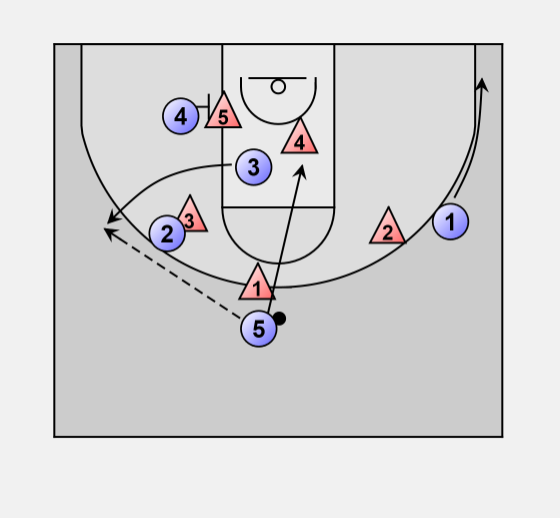 3 fakes his shot. 5 is free gets the ball and plays 1 on 1.
