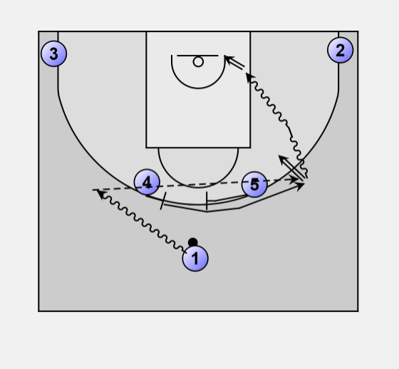 Instead of rolling to the basket 4 gets a screen from 5 and receives the ball from 1 outside the 3-point area.