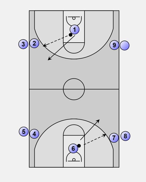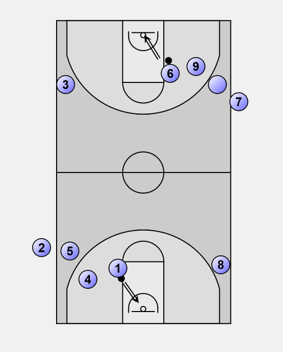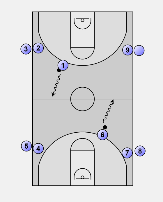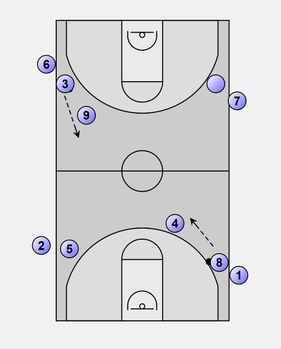 After their lay-up, players 1 and 6 line up behind players 8 and 3.