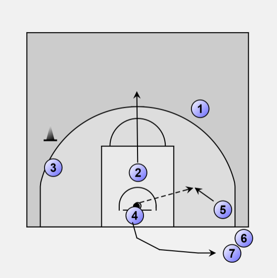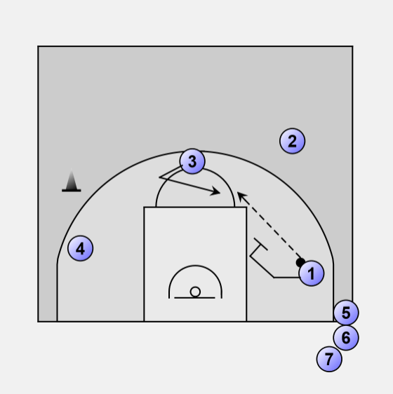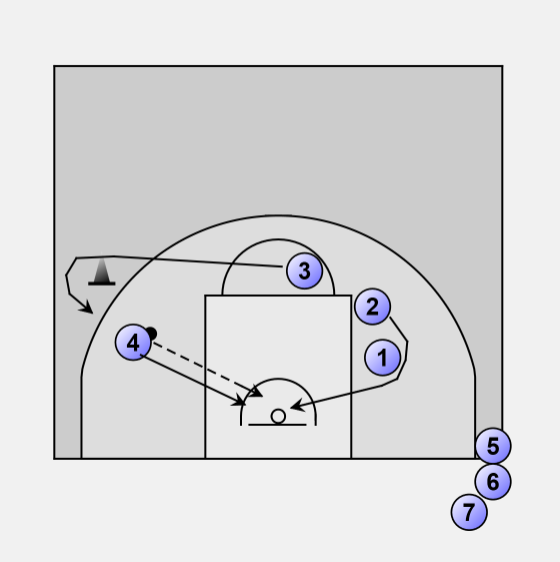 3 slides away from his pass towards the cone at free throw line extended.