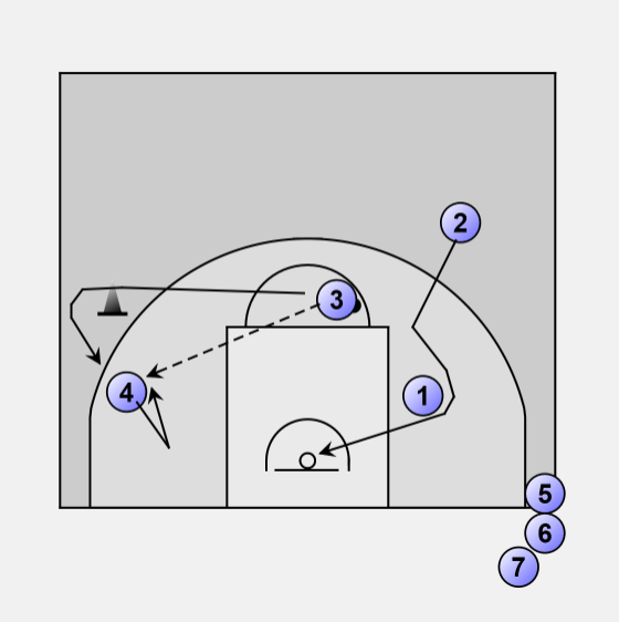 3) 4 passes to 1 rolling to the basket, 1 passes the ball back out to 3 who shoots the 3 point shot (1 goes to cutter, 2 to high post, 4 rebounds and makes the outlet pass before joining line out of court, 3 stays in position)