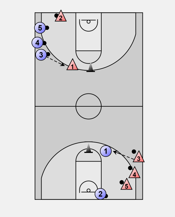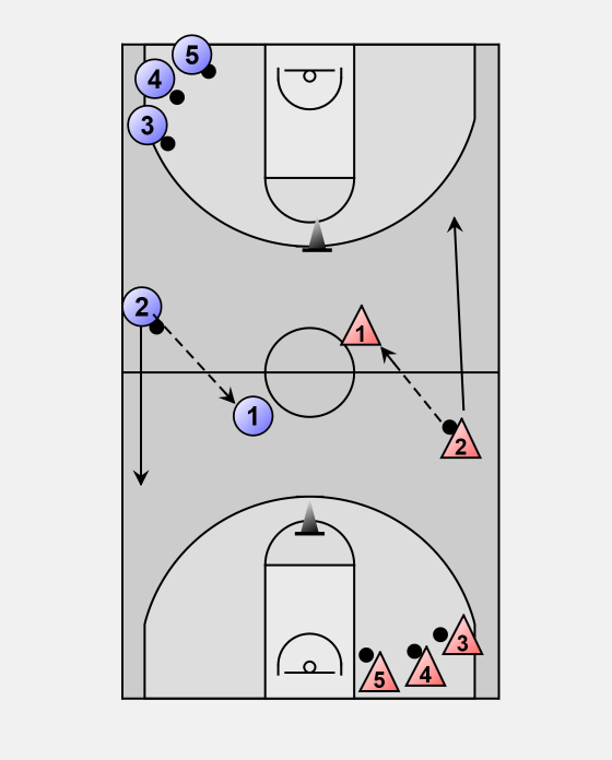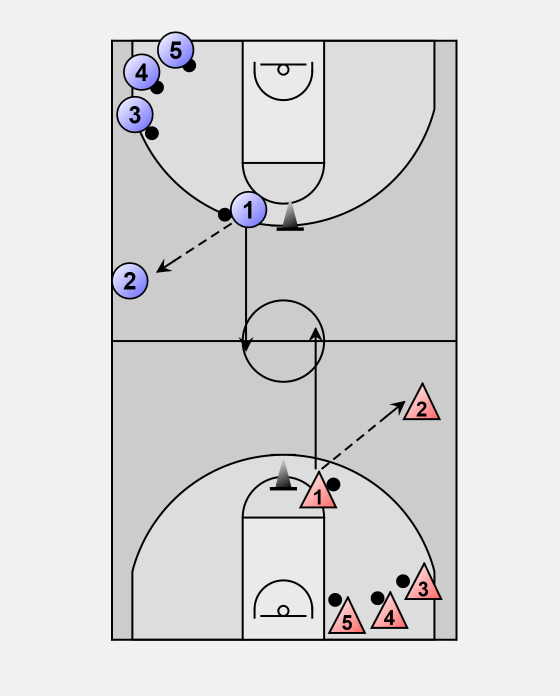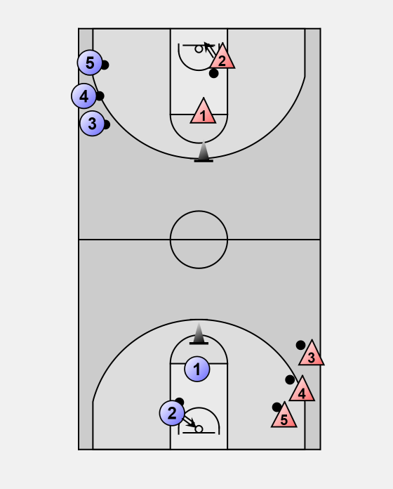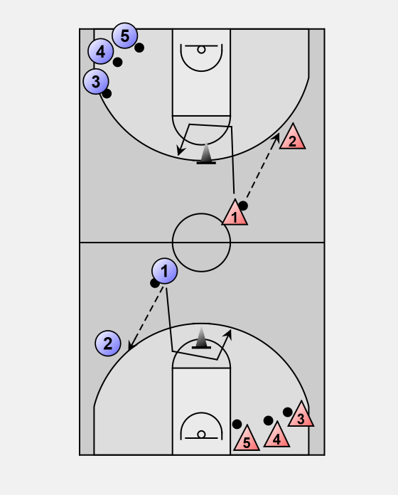 • Two lines of players at the opposite corners of the court, each has the ball.