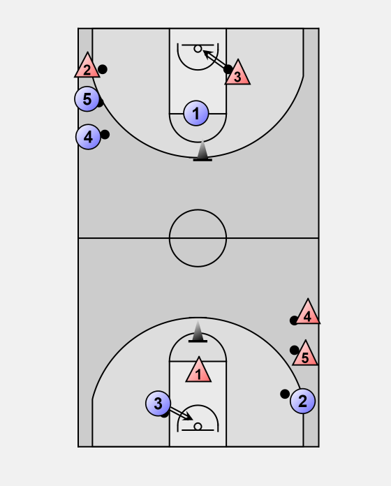 As soon as middle player or passer reaches the top of the key the drill begins for the next players in row. (#3)