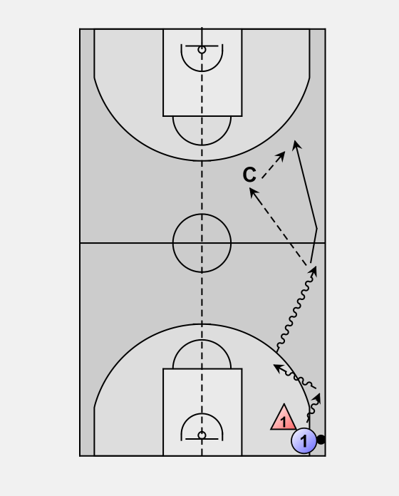 Once offense gets to half way they have the option of passing to the coach (who is standing midway between 3 point line and half way) or continue to penetrate to the basket. If pass goes to the coach, offense will lead for the ball for return pass and scoring option (give and go). Defense must jump to the ball and deny pass back.