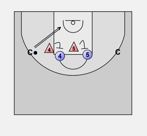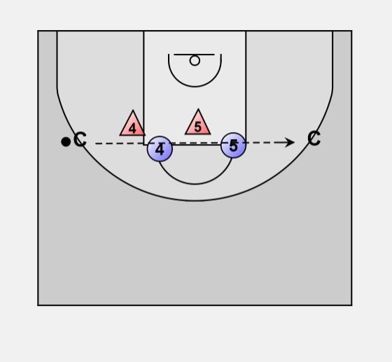 Posts start in high post position with defense and 2 coaches / players on the wings as passers.