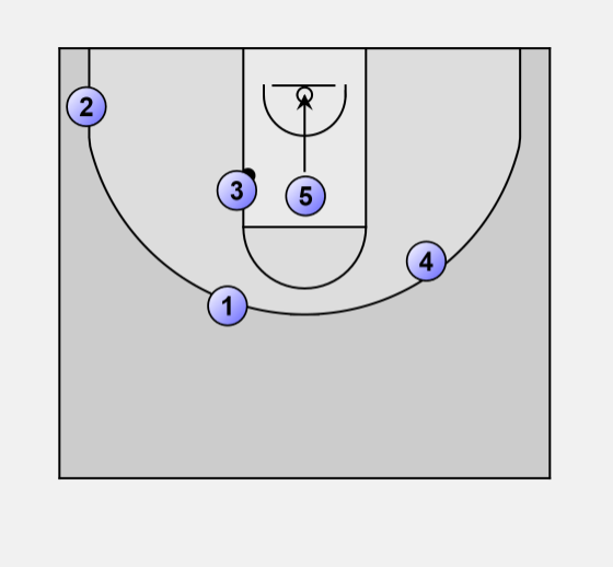 6. 3 has many options of the mid-post: go one-on-one in the post; 2 (shooter) in the corner; 5 cutting to rim; 4 on wing (shooter or slasher); and 1 as a pressure release option.