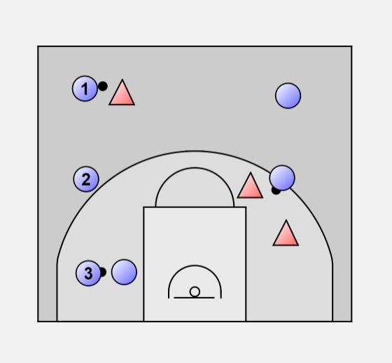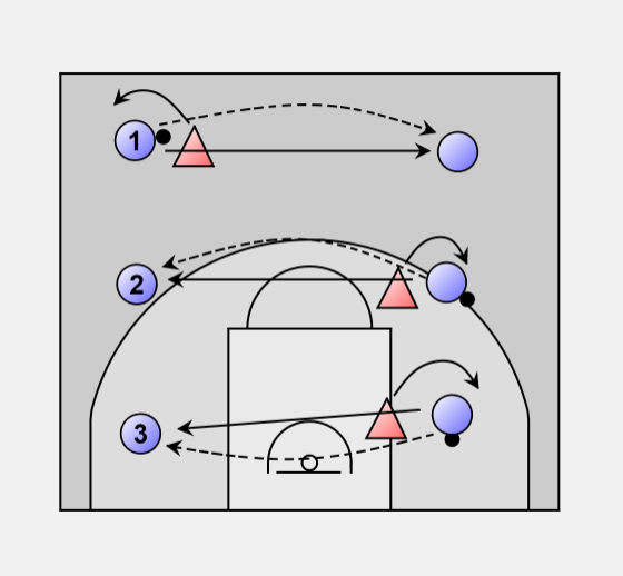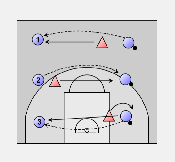 This drill is used to teach close-outs, defending the non-pivot foot and stepping into the offensive player if the ball is raised over the head.