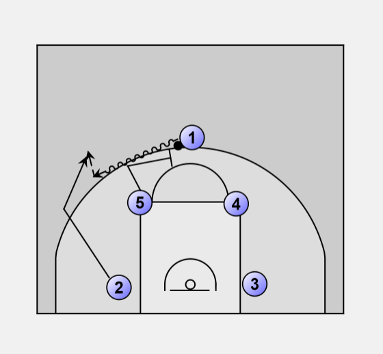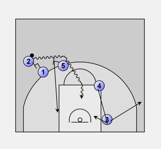 2 uses the screens to get to the middle of the lane for a shot, kick out to 3, to 4 or 5 on the block.