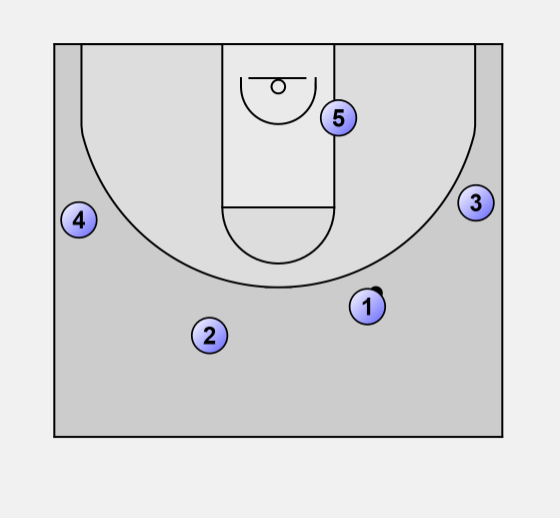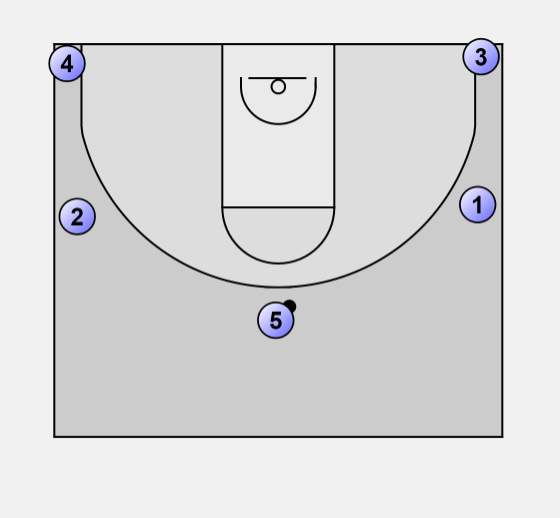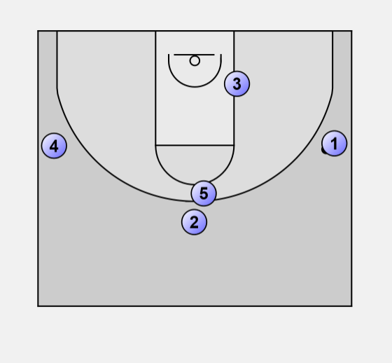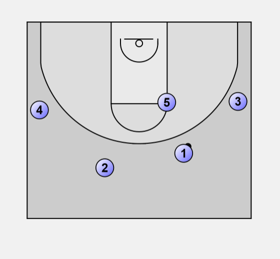 Low" is shown here. This set usually begins each possession. In this set, the guards are high and are one step outside the lane-line extended. The off-guard stays one step behind the guard with the ball. The wings are free-throw line extended and are one step from the sideline. The post is in the midpost.