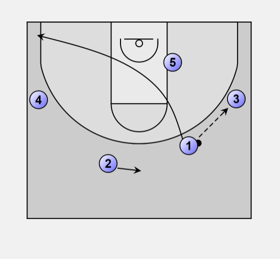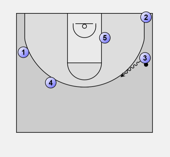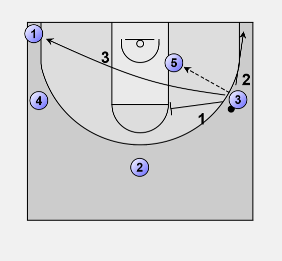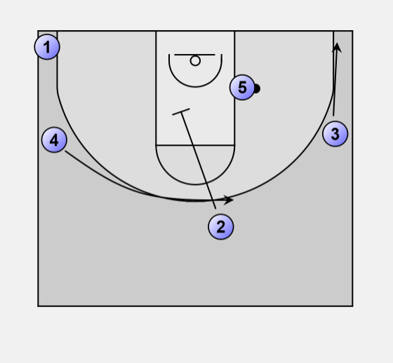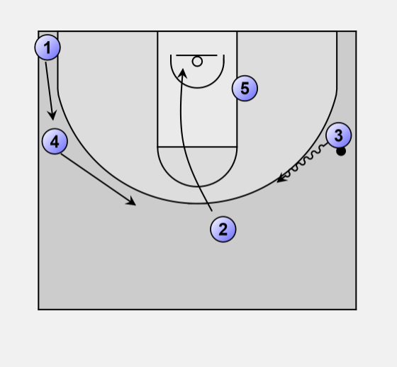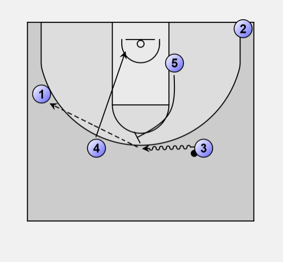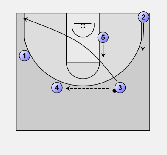 If 3 passes to 4, 3 makes a diagonal cut to the basket looking for a return pass. If 3 doesn't get a return pass, he cuts to the opposite corner.