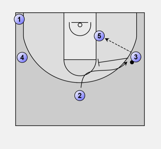 In this option, 3 elects to screen at the elbow for 2. 5 looks to score first, then he looks at 2 coming off of the screen.