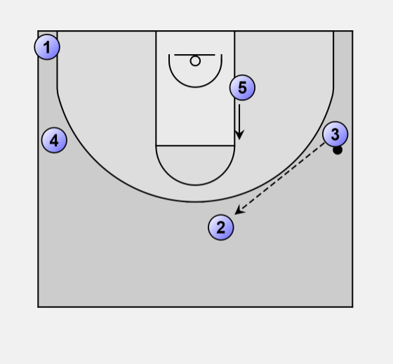 If he passes to 2, 2 looks to shoot. If 5 passes up to 3, 5 moves up to the elbow, and "high" is run. Of course if 3 is a shooter and is open, he may shoot after receiving 5's pass.