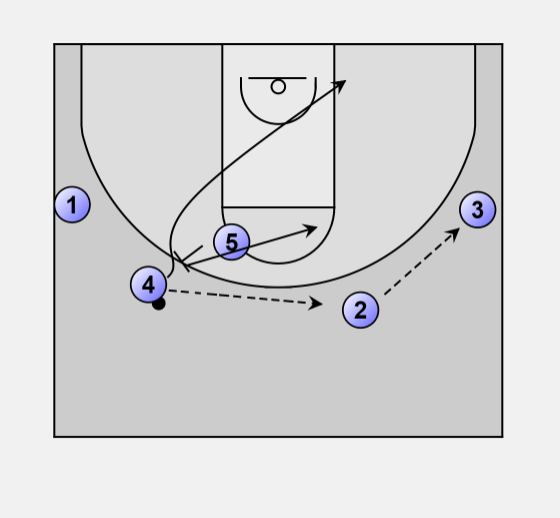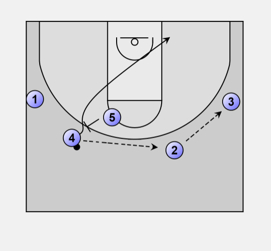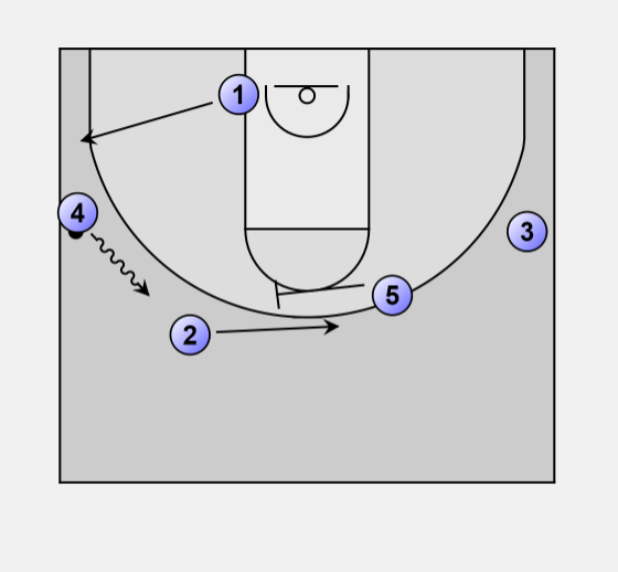 If 4 cannot get the ball to 1 underneath, he dribbles up and looks to pass to 2 coming off of 5's screen.