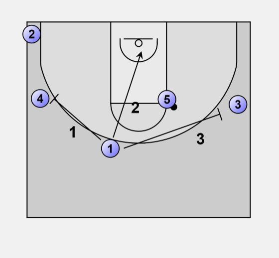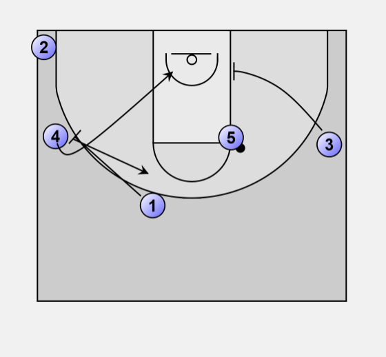 If 1 chooses to screen away, on 1's screen, one player always cuts to the basket and the other one cuts to the ball. For example, in the diagram, 4 reads the defense and curls to the basket. 1 therefore comes back to the ball.