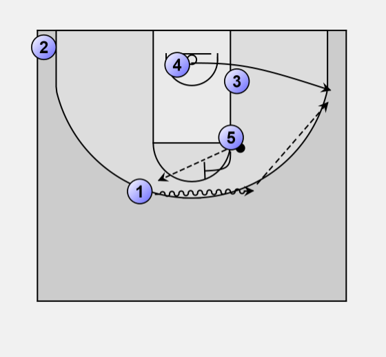 The player coming back to the ball (in this case, 1) receives a pass from 5 then dribbles off of his screen.