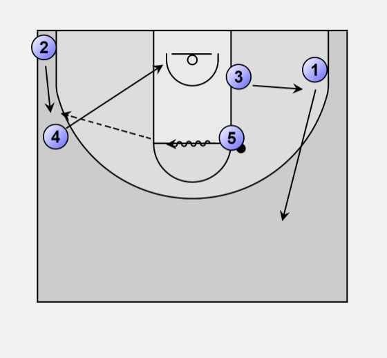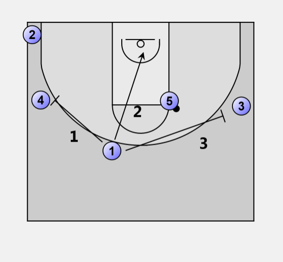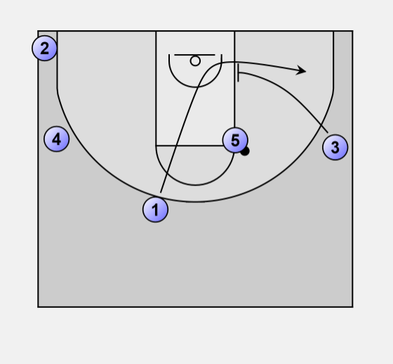 On the pass into 5, 1 may elect to cut backdoor. 5 looks at 1 cutting, then looks at him again as he comes off of 3, who has again set a screen on the block.